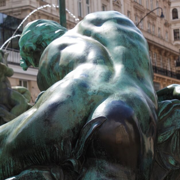 Dass nicht alle Wiener prüde waren, zeigt uns der Donnerbrunnen abseits der belebten Kärntnerstraße. Dort reckt uns eine der gußeisernen Statuen ihren blanken Hintern entgegen. Touristengruppen stehen drum herum. Offenbar verlockt die Statue zum Berühren, denn ihr Hinterteil ist verdächtig blank gerieben.